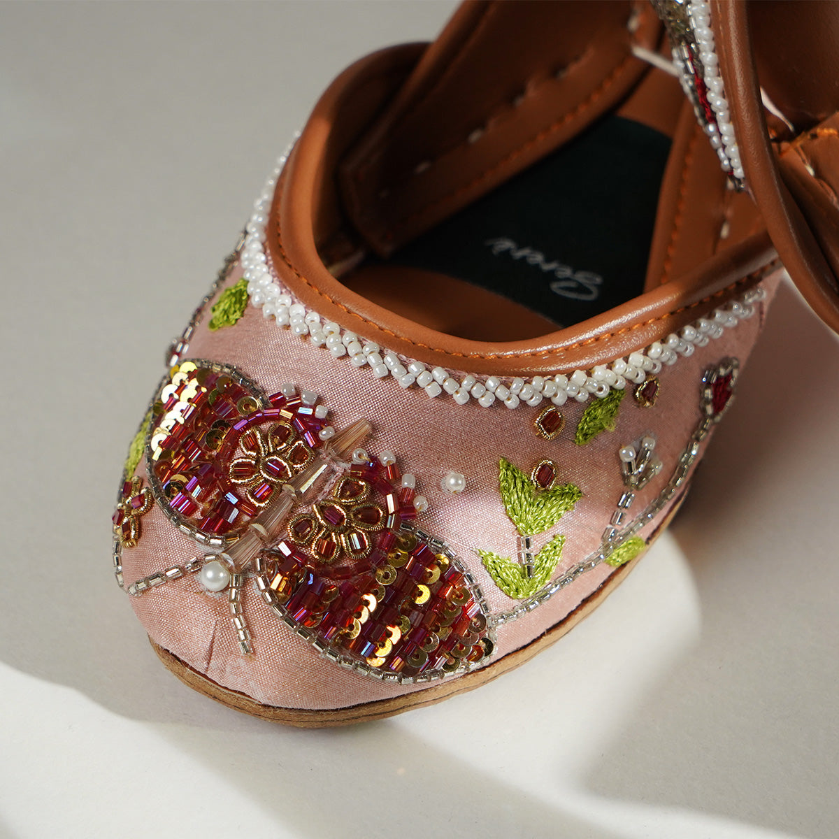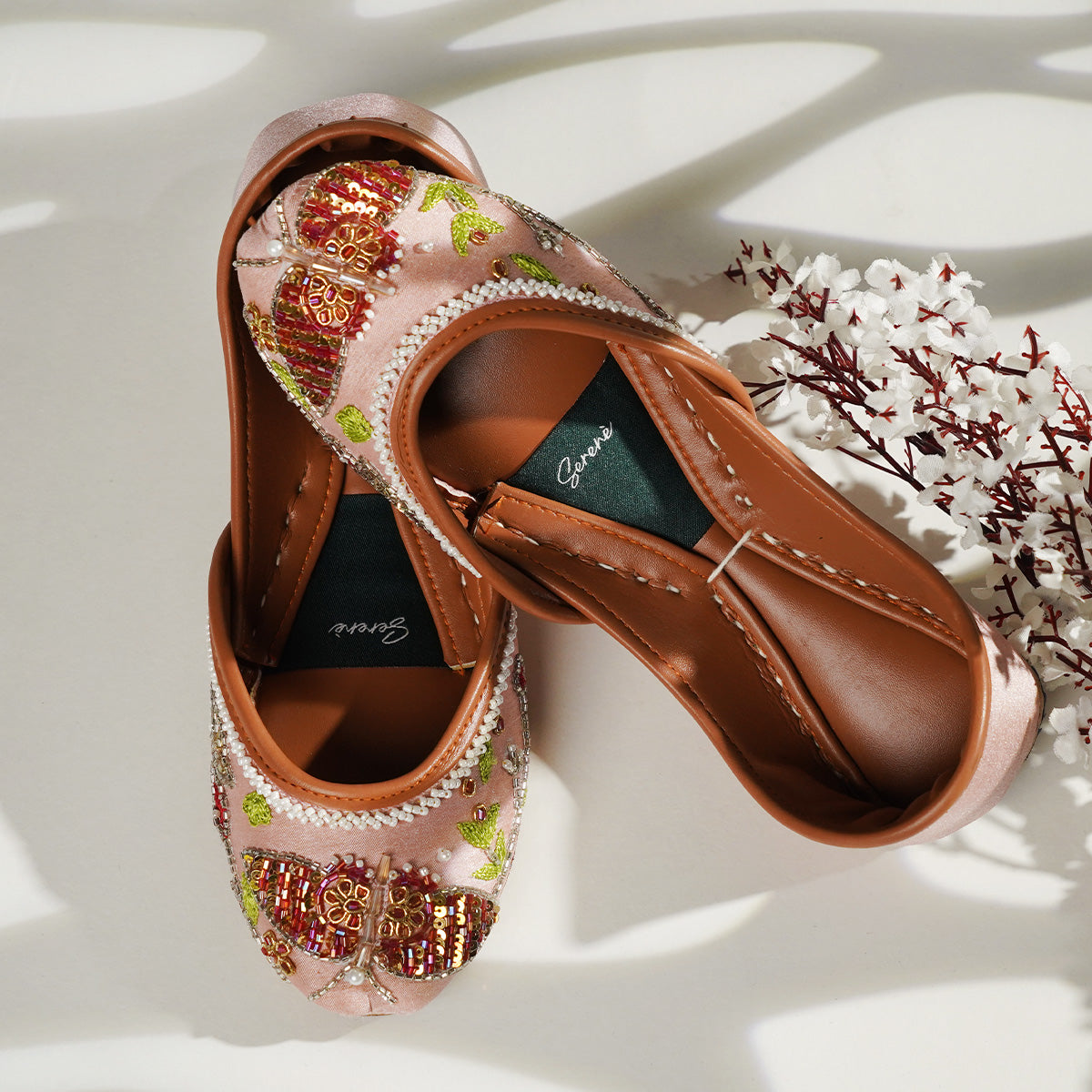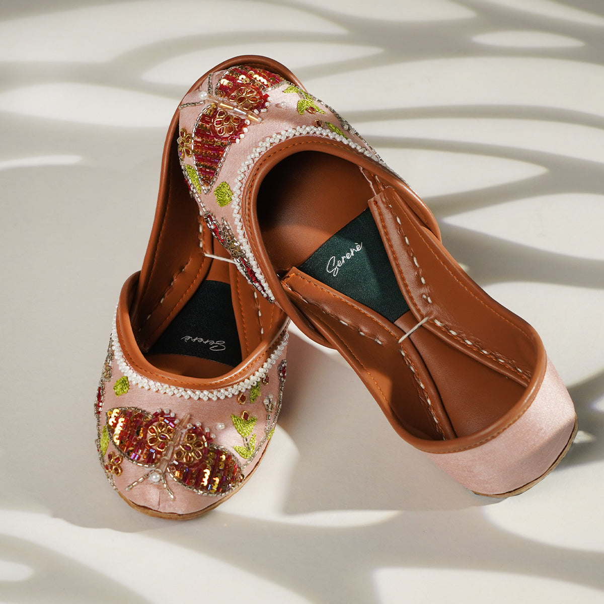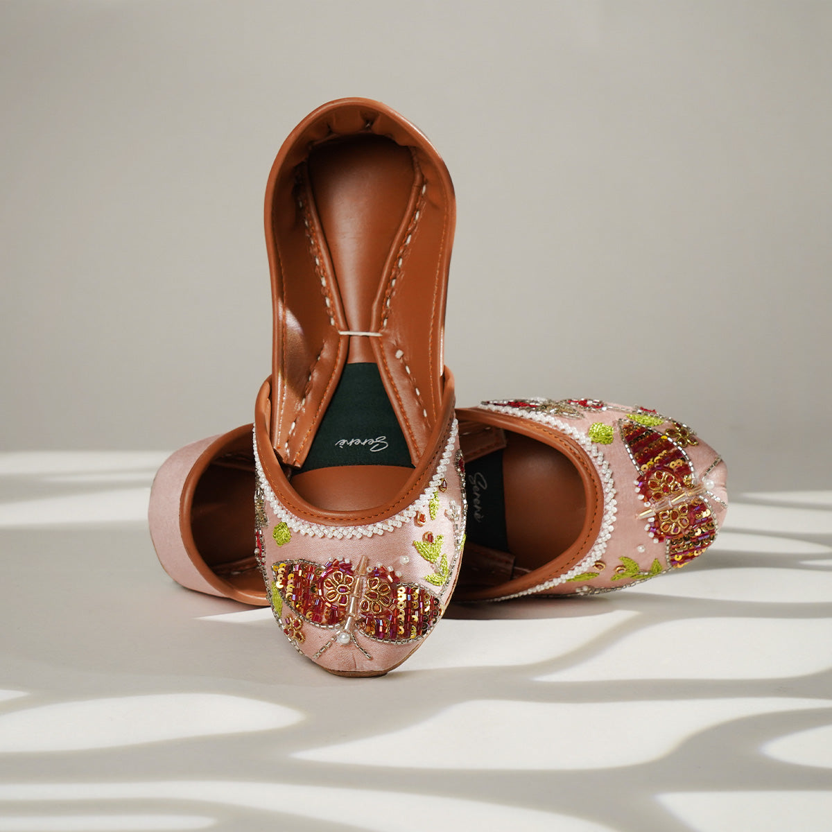 This premium design showcases the finest artisan skill beautifully adorned with a detailed butterfly pattern created using shimmering cut dana, white pearls, and fine thread work. The sophisticated color combination and luxurious soft sole guarantee ultimate comfort and a distinctive, elegant presence. This is the ultimate statement piece for special occasions.