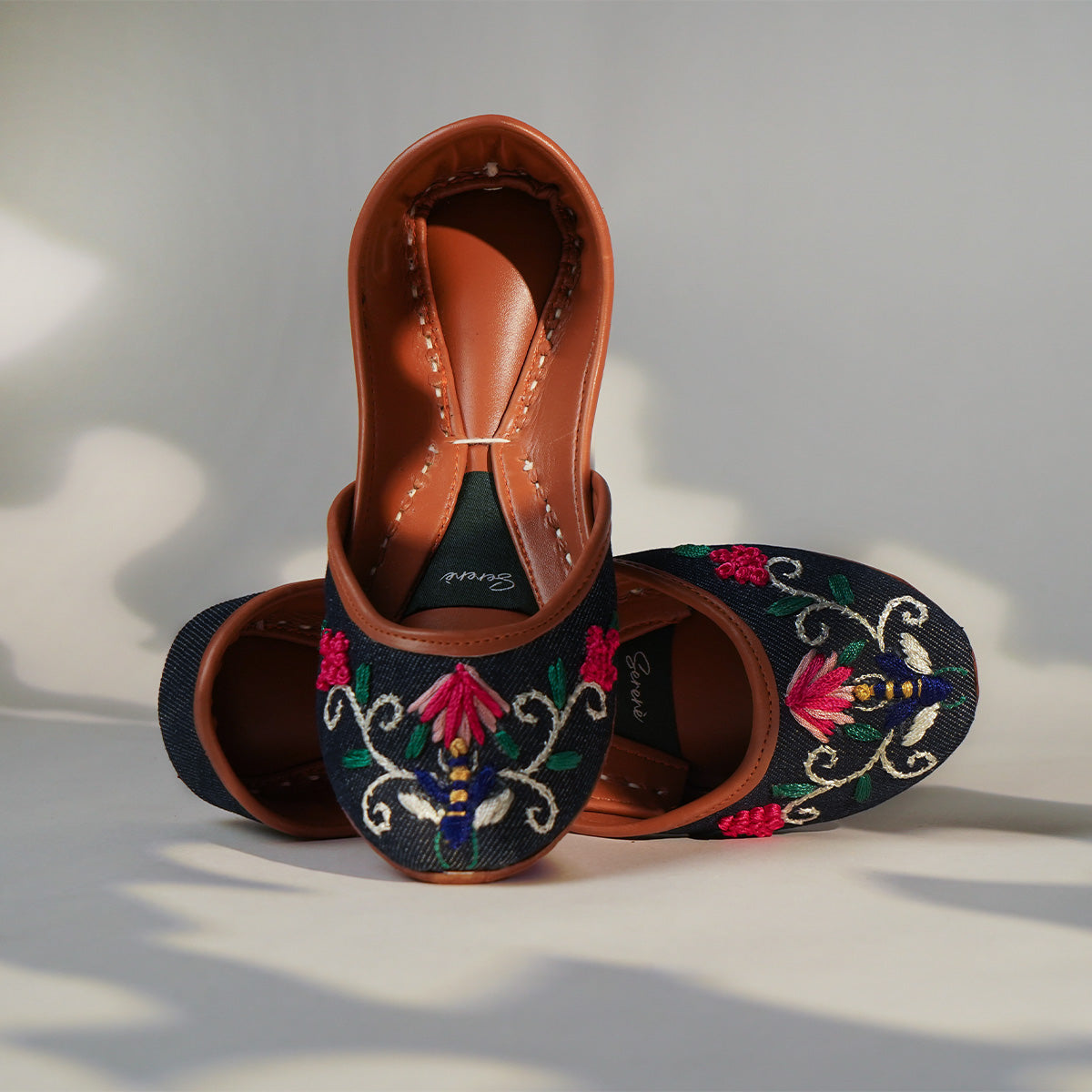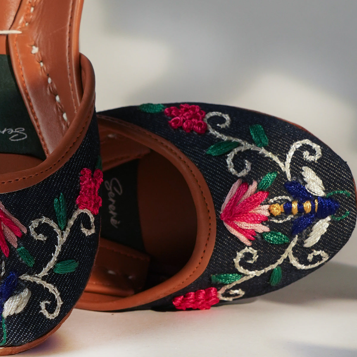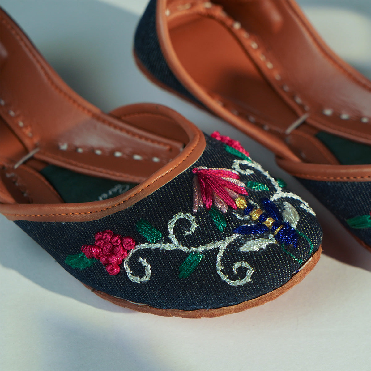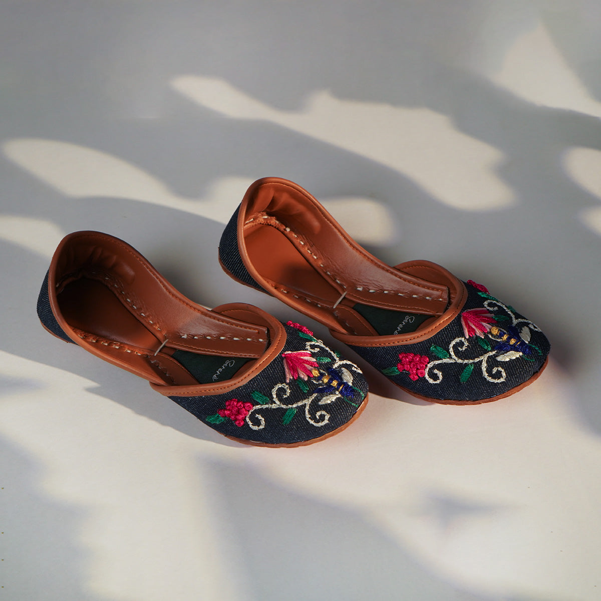 This denim khussa features colourful hand embroidery that adds a vibrant pop to its classic design. Made with a comfortable sole, it’s perfect for everyday wear without compromising on style. The denim base makes it easy to pair with both traditional outfits and casual western looks.