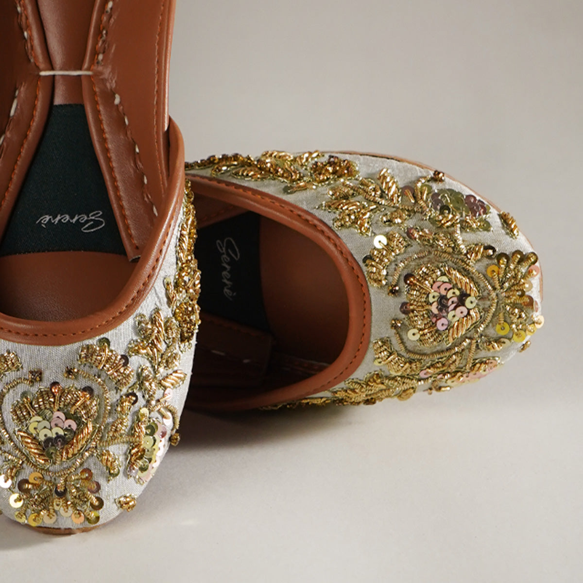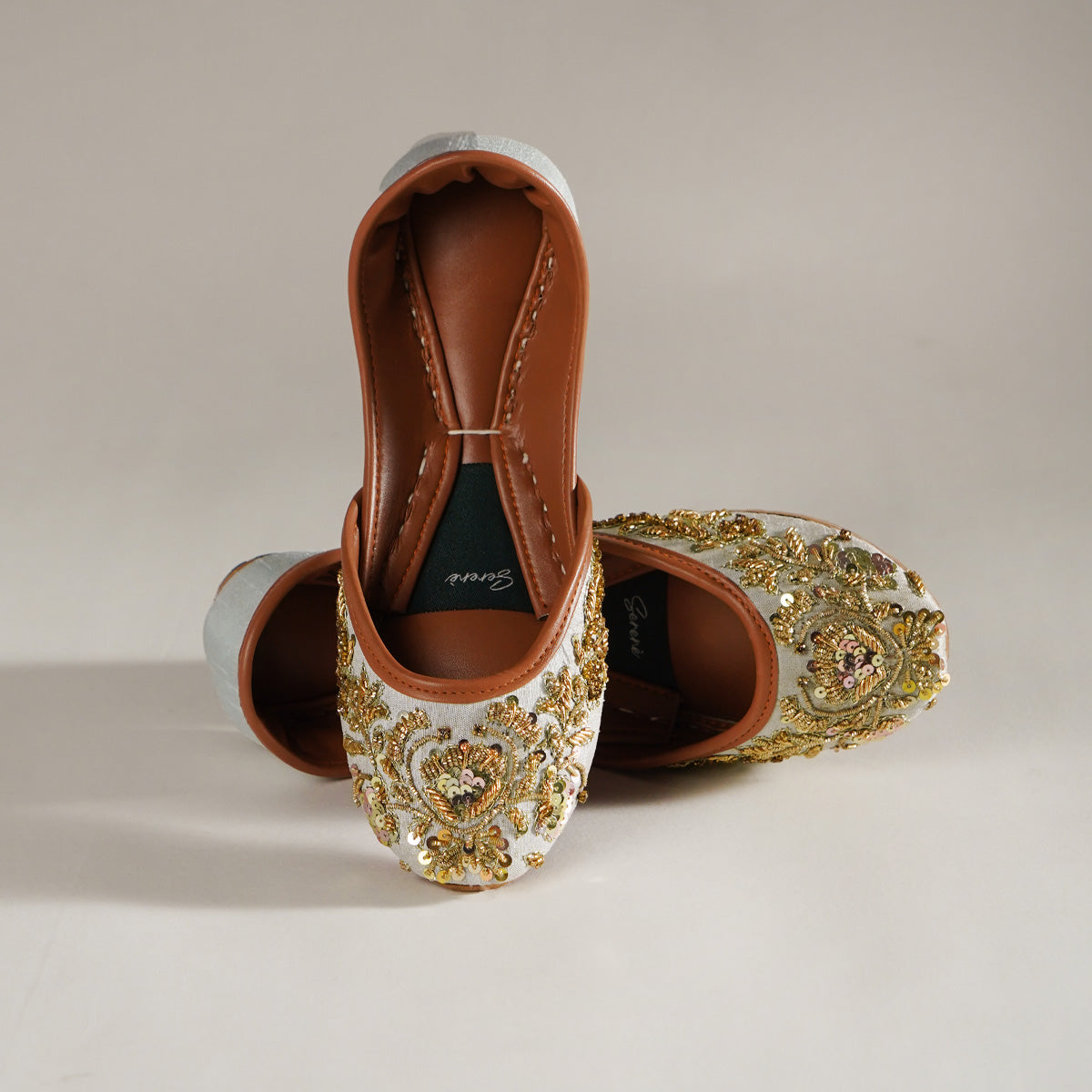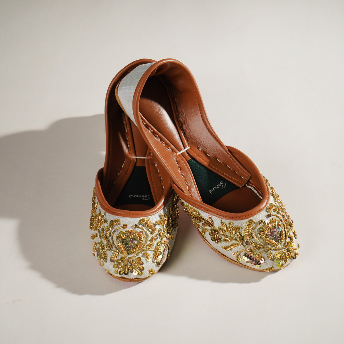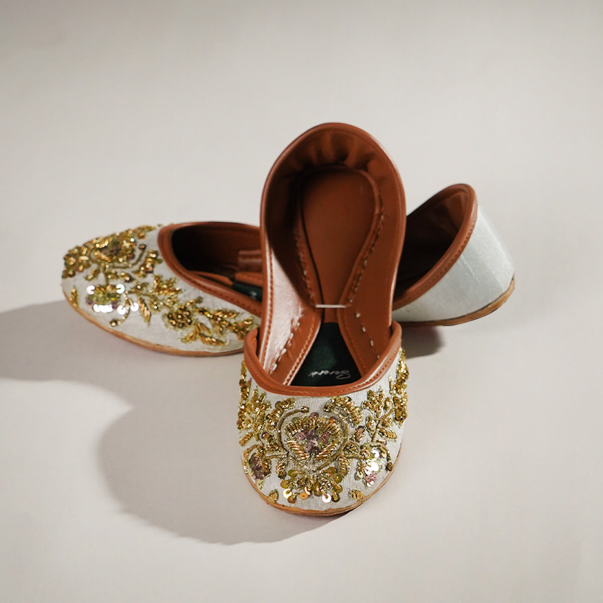 This stunning Khussa is perfect for wedding wear, featuring heavy handmade embellishment with luminous golden sequins, pearls, and zari, detailing the toe and continuing elegantly onto the back of the shoe. Designed for comfort during long events, this piece ensures sophisticated sparkle from every angle.