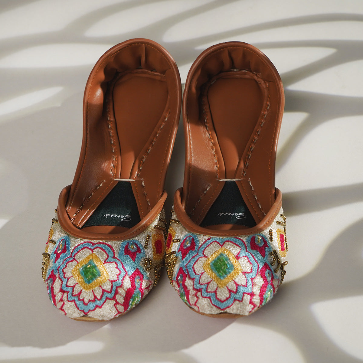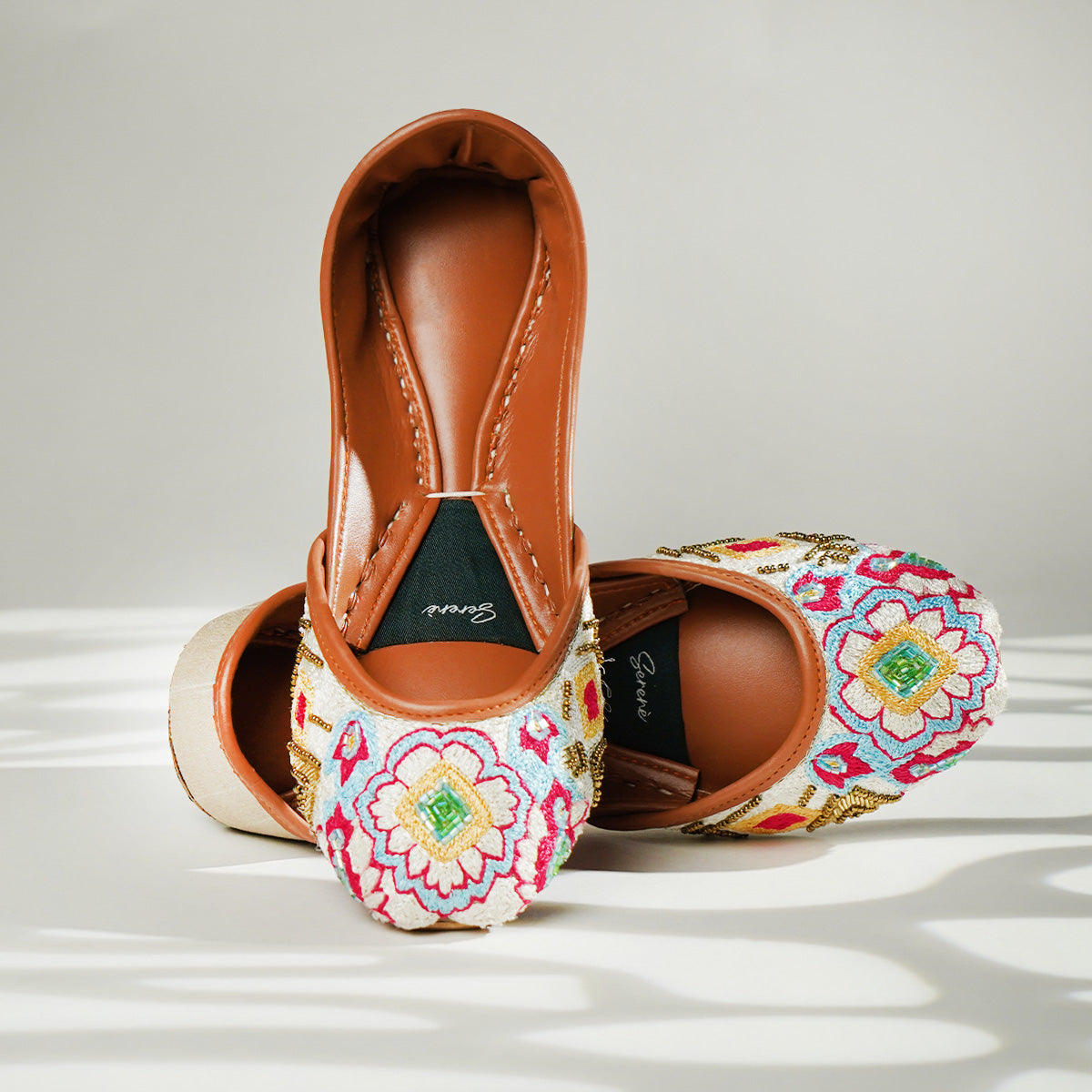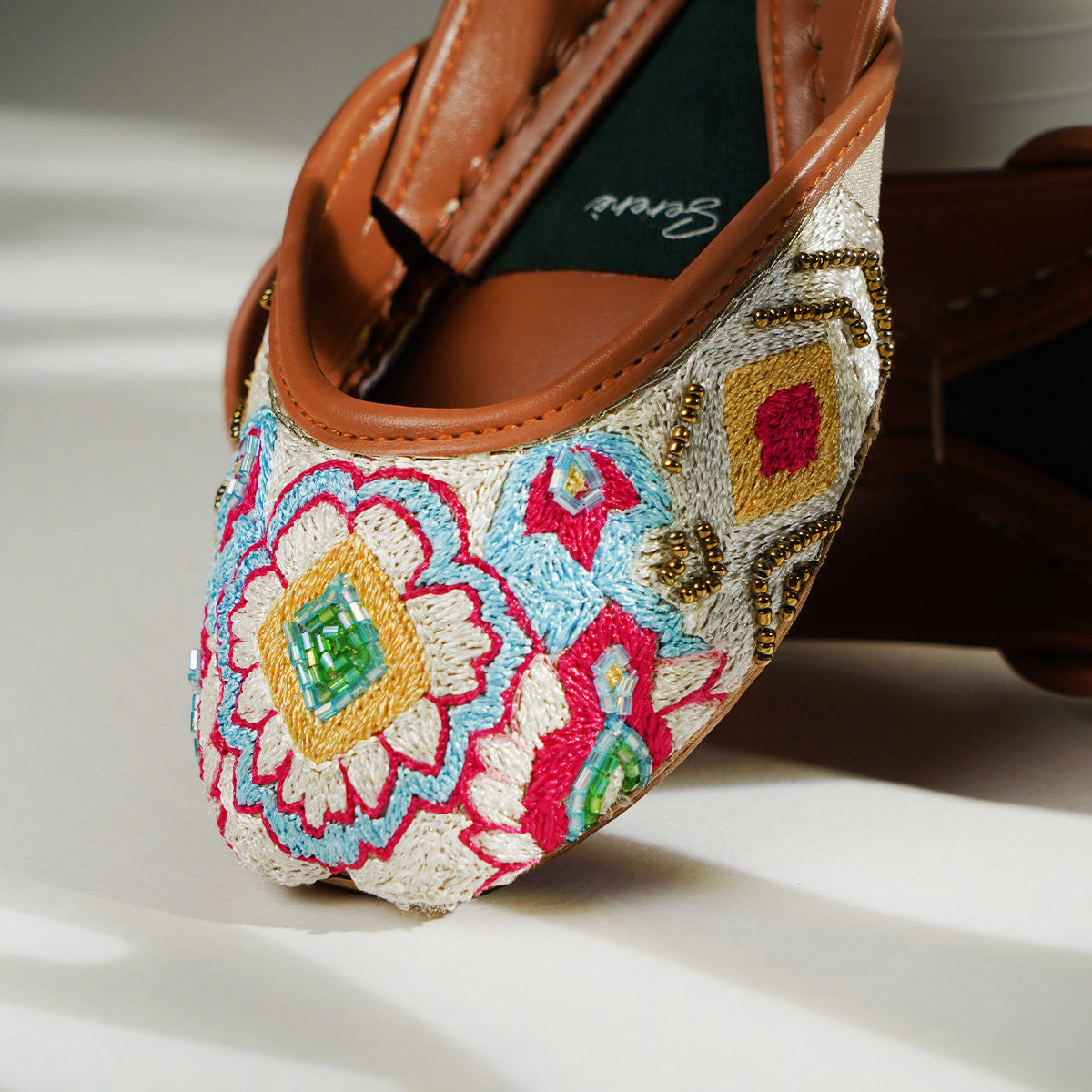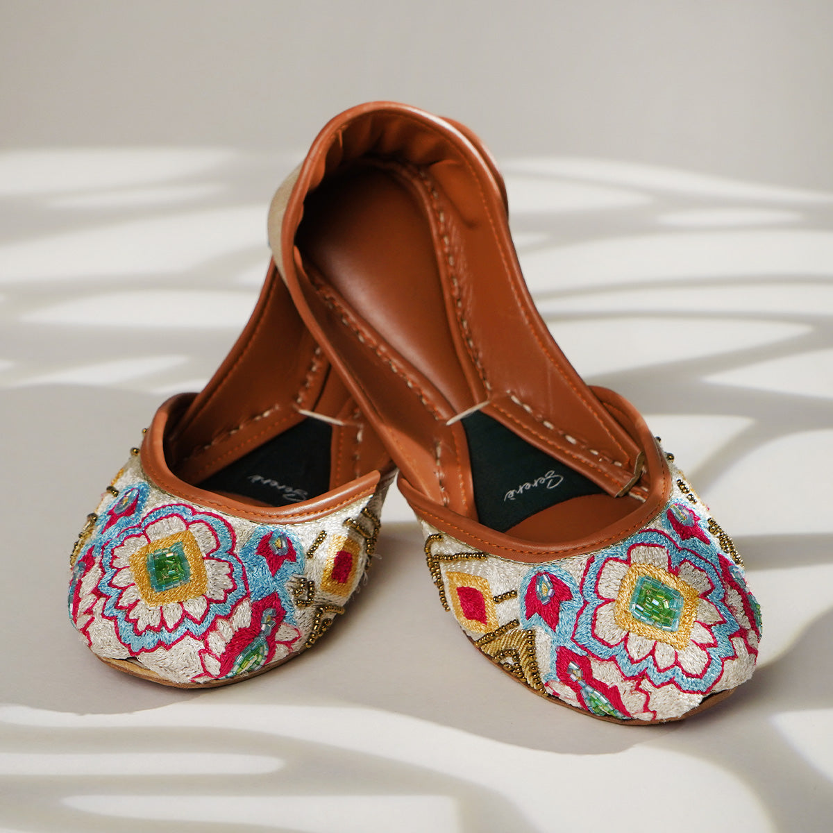 A brilliant tapestry of multi-color embroidery threads, luminous beads, and delicate small pearls. This beautiful color combination ensures it can effortlessly pair with any dress in your wardrobe. This statement khussa delivers comfortable style and vibrant elegance for every occasion.
