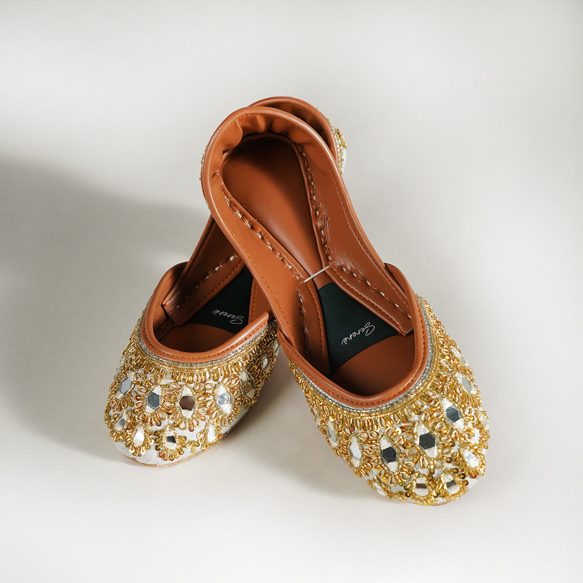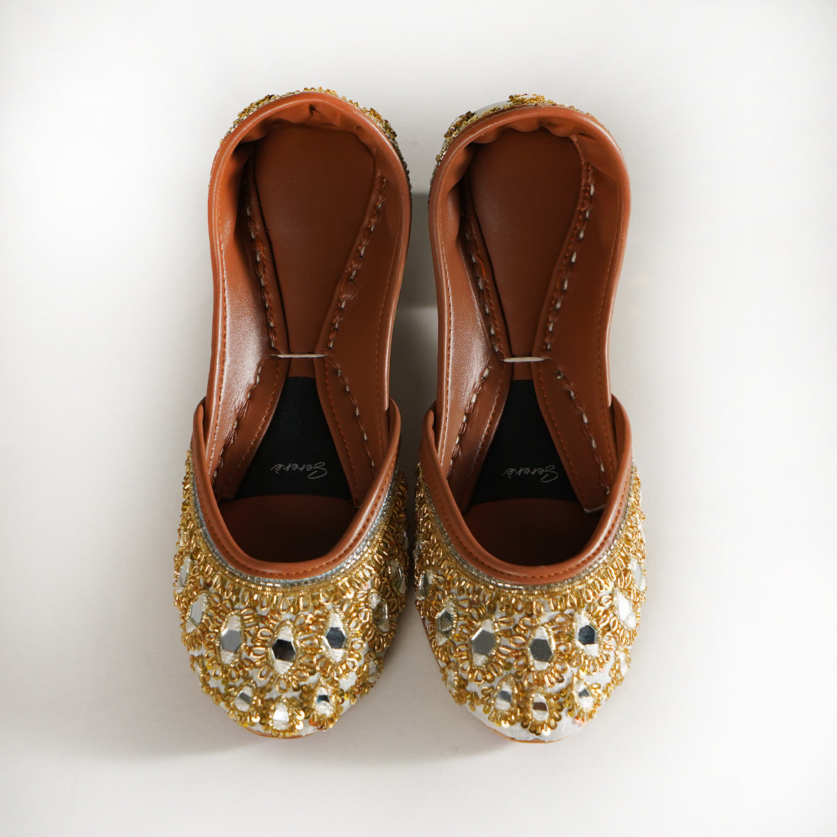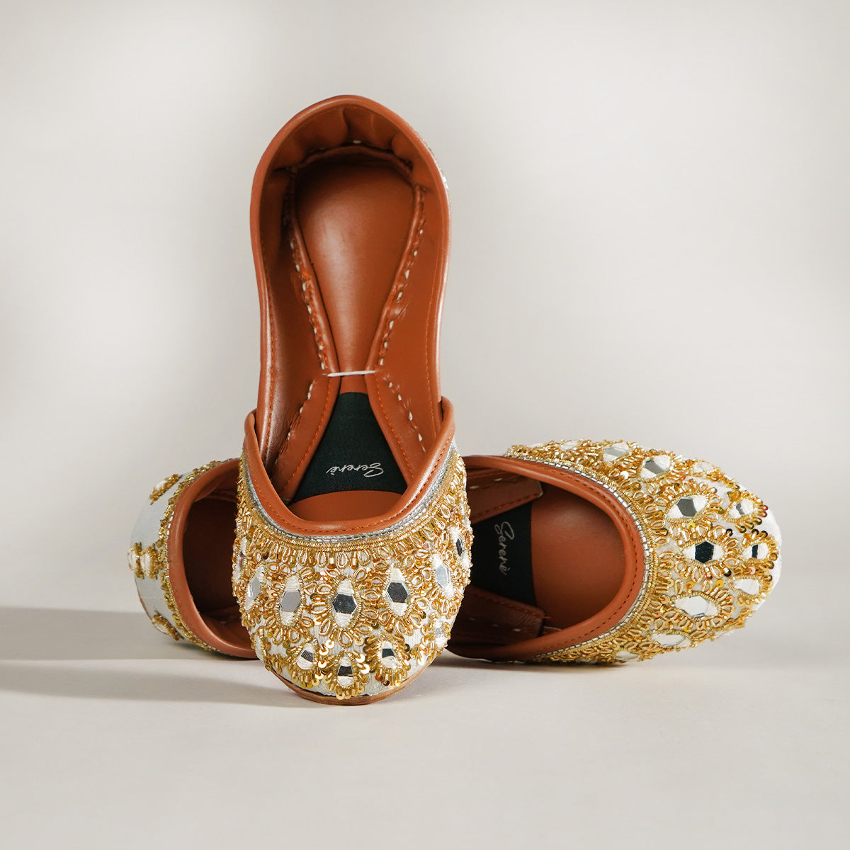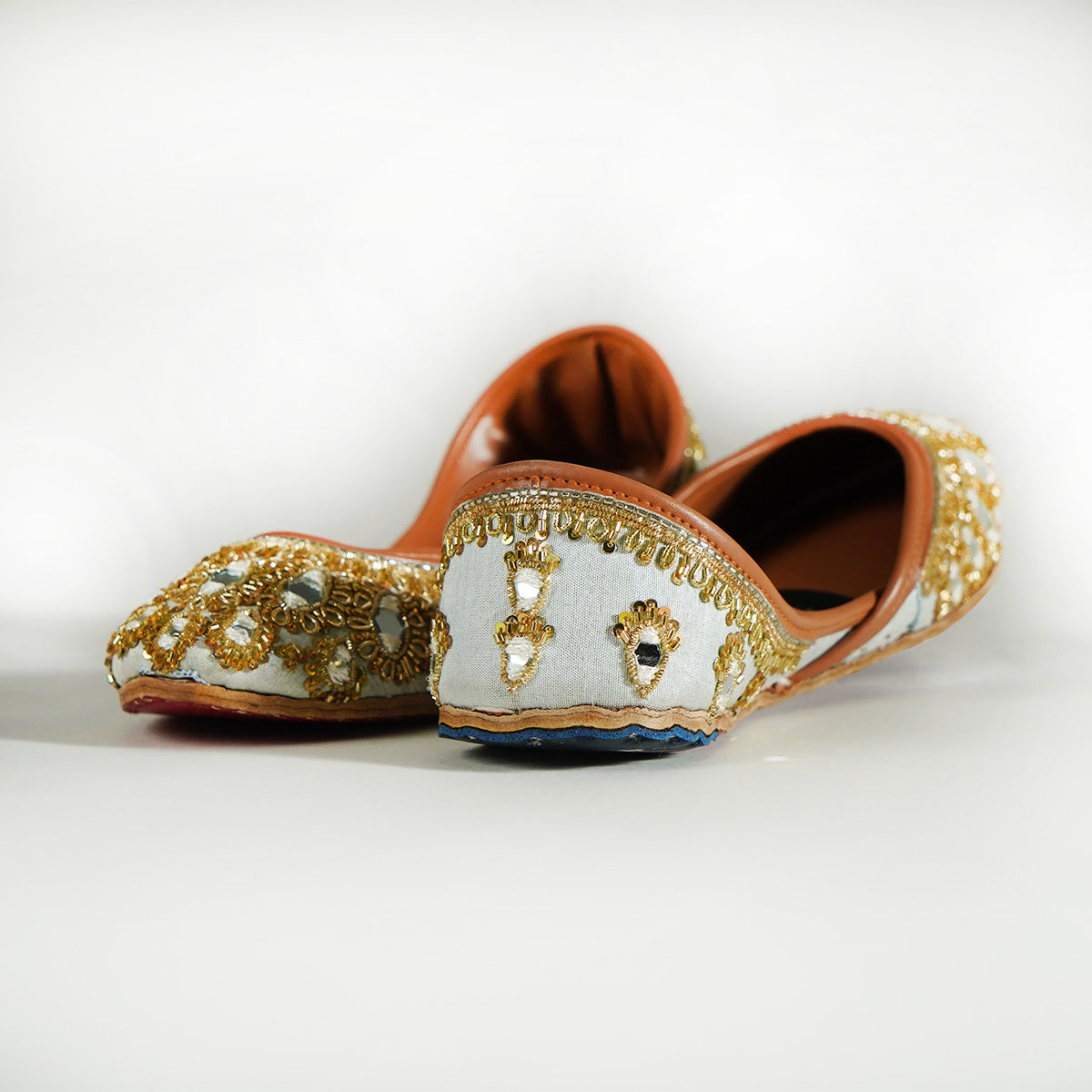 This Khussa is a perfect example of fine artistry, heavily handmade with dazzling mirror work, intricate golden gota work, and exquisite embellishments covering the toe and continuing onto the backside. Designed to complement your wedding outfits, this stunning pair ensures supreme comfort and a show-stopping presence for any event.
