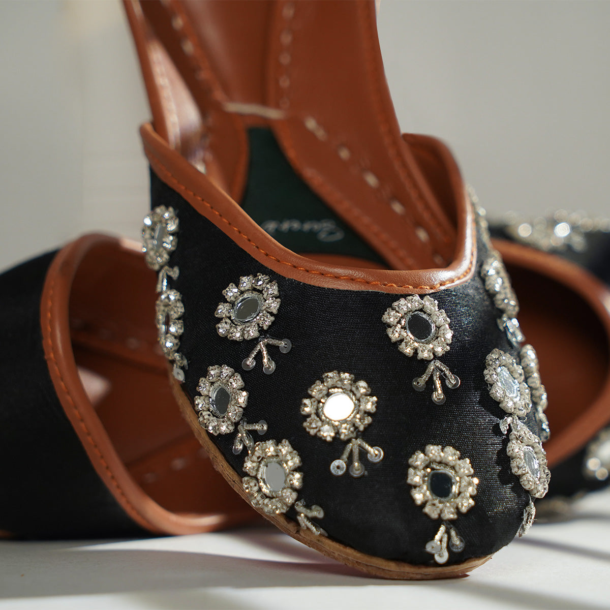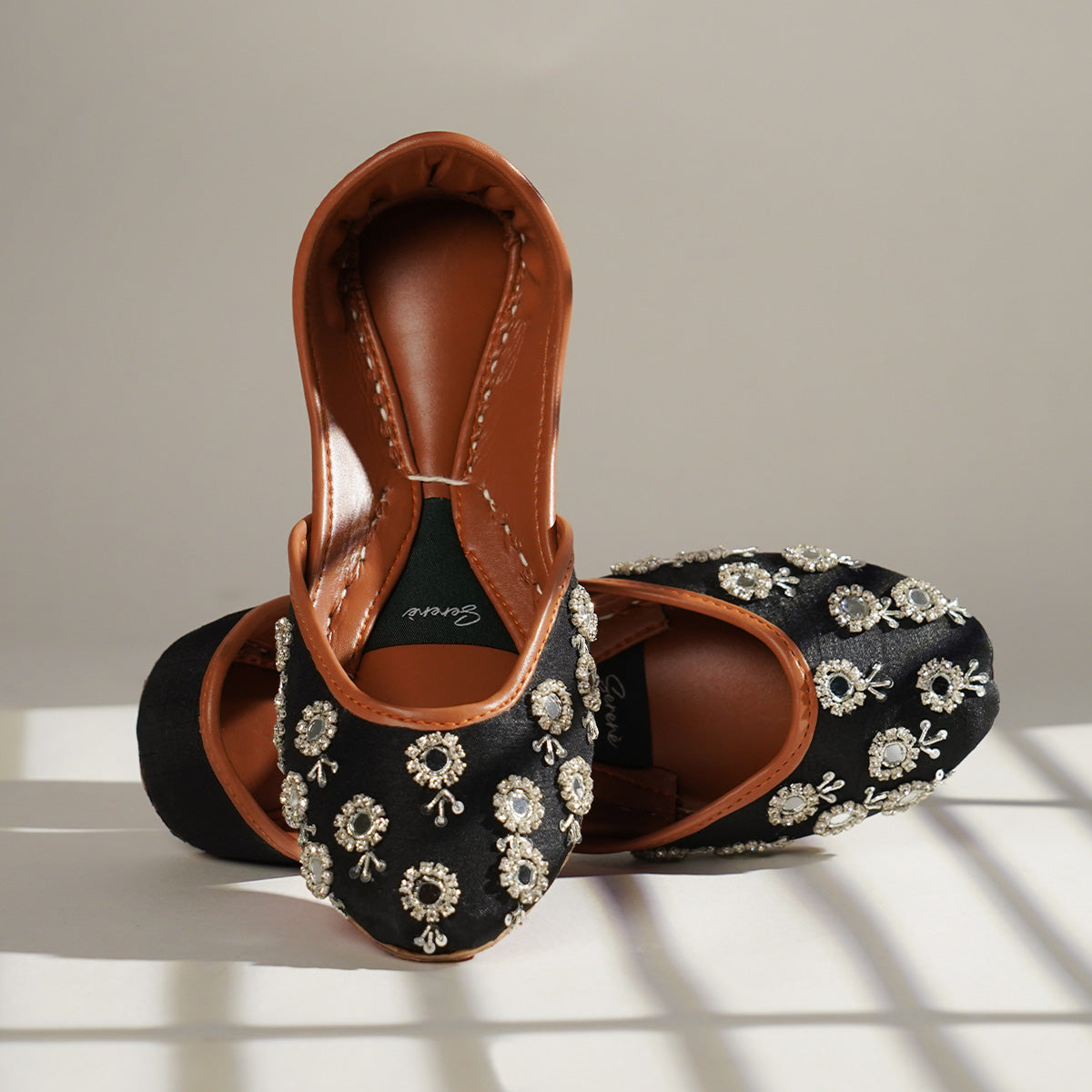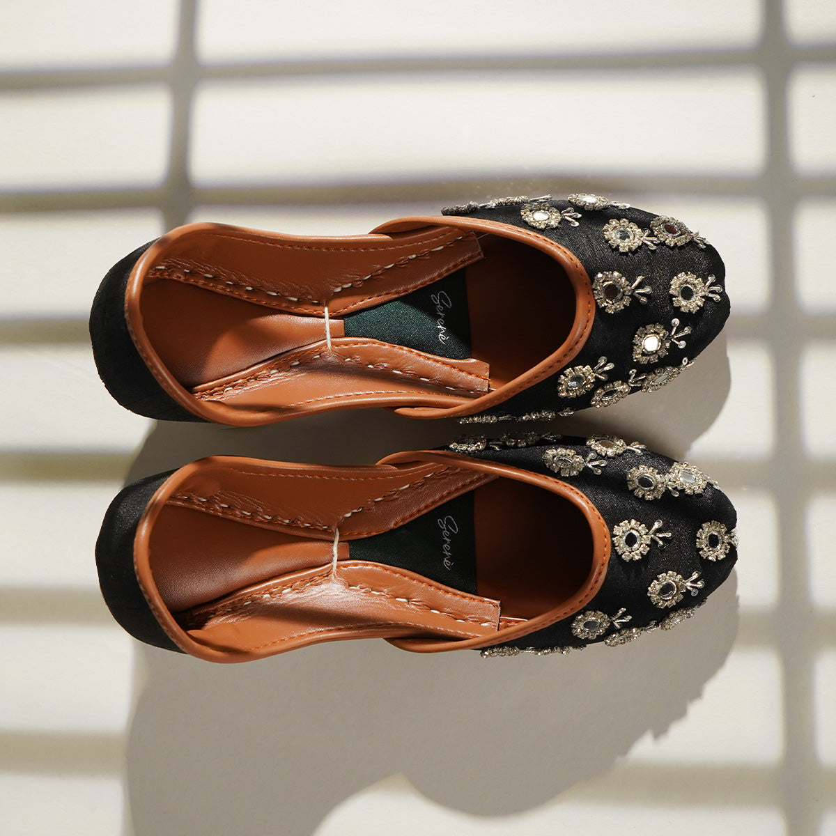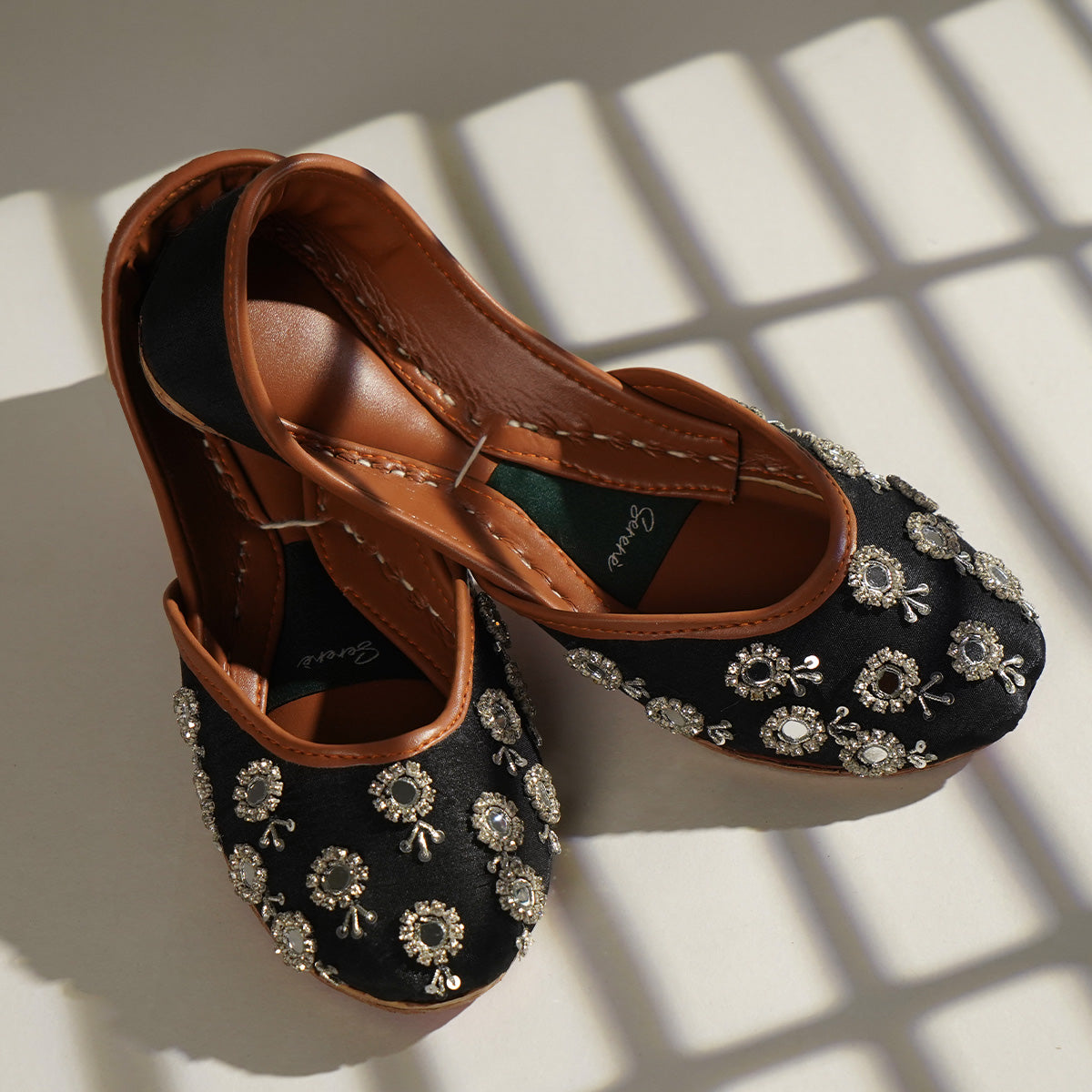 Elevate your formal wear with this luxurious black hussa heavily adorned with shimmering round mirrors, luminous white pearls, and dazzling sequins. Handcrafted for supreme comfort, it features a soft sole and premium lining, ensuring you step out with sophisticated elegance. This is the perfect traditional choice for any evening or formal celebration.