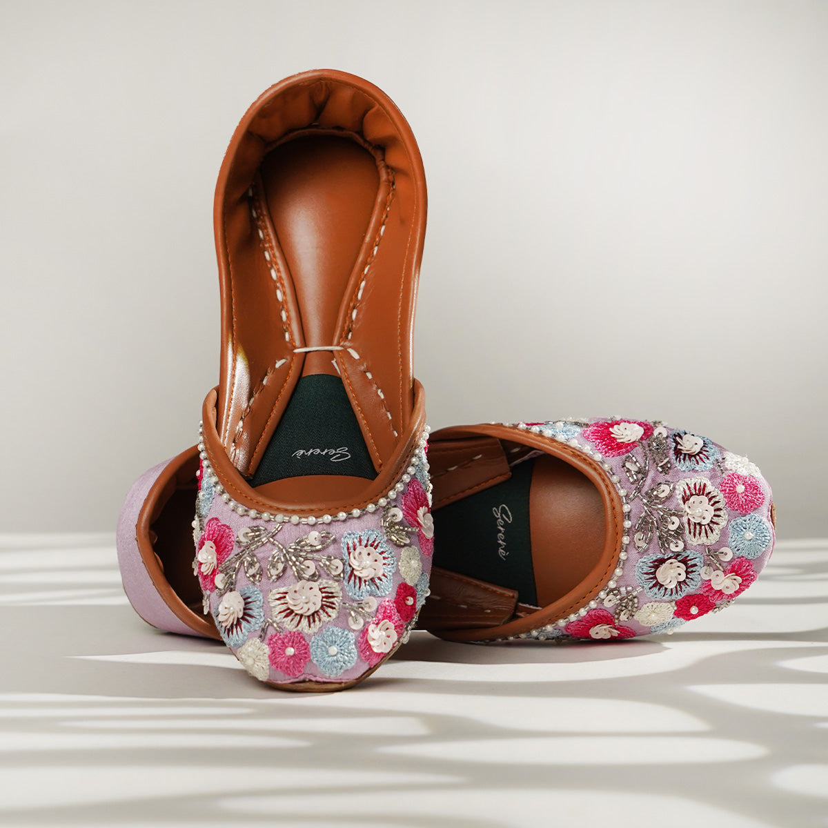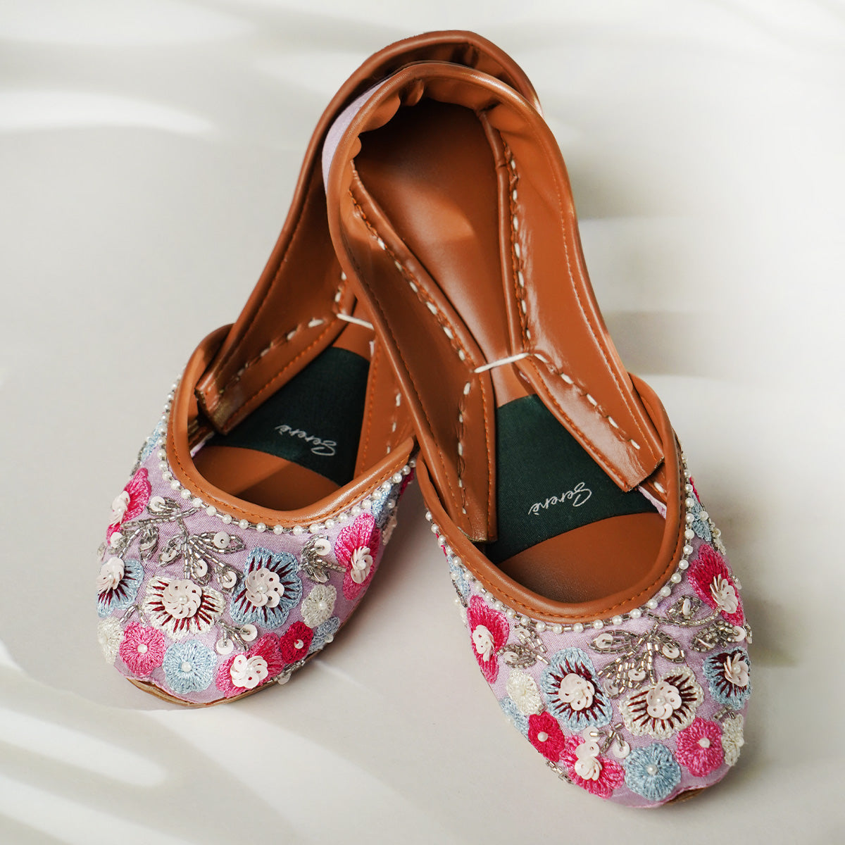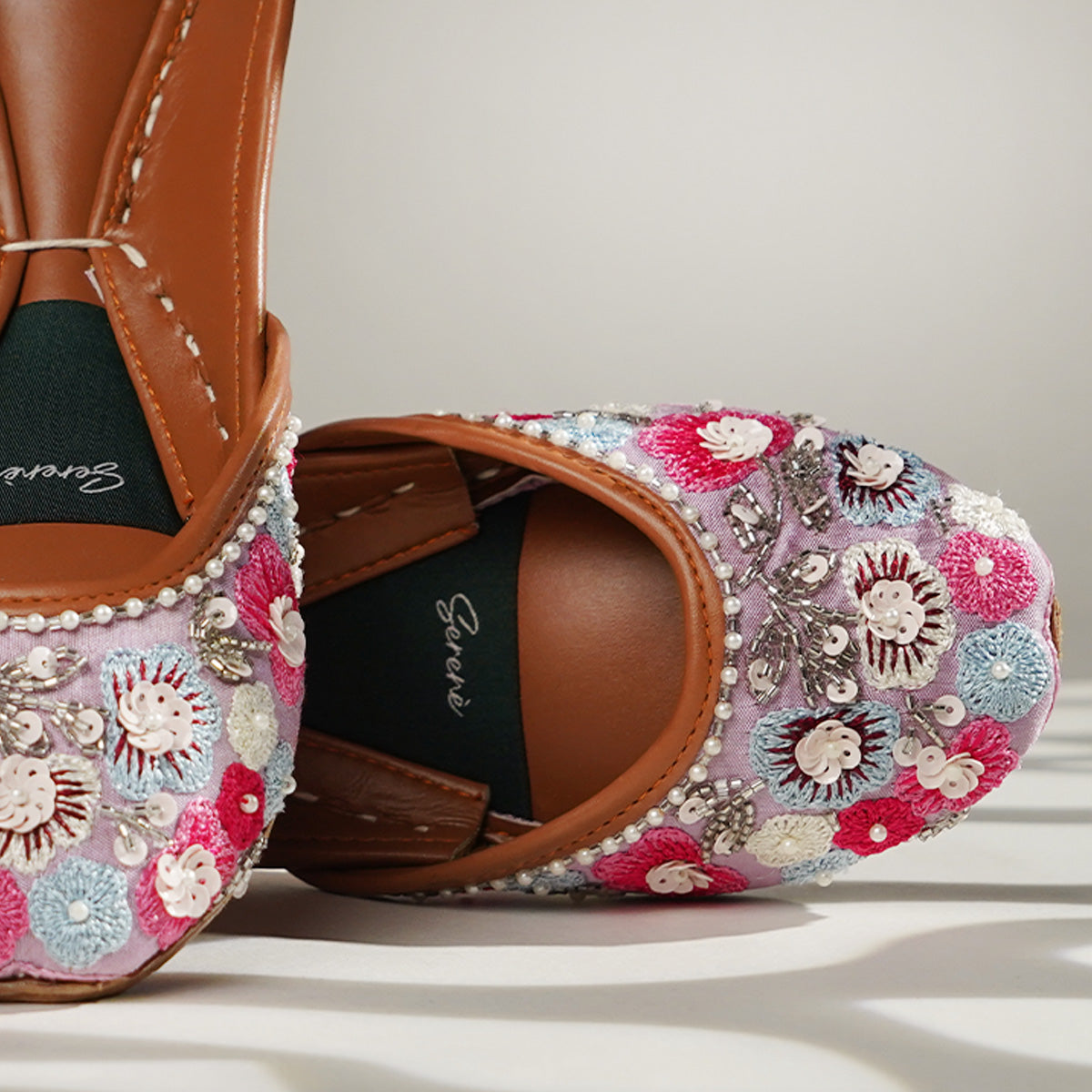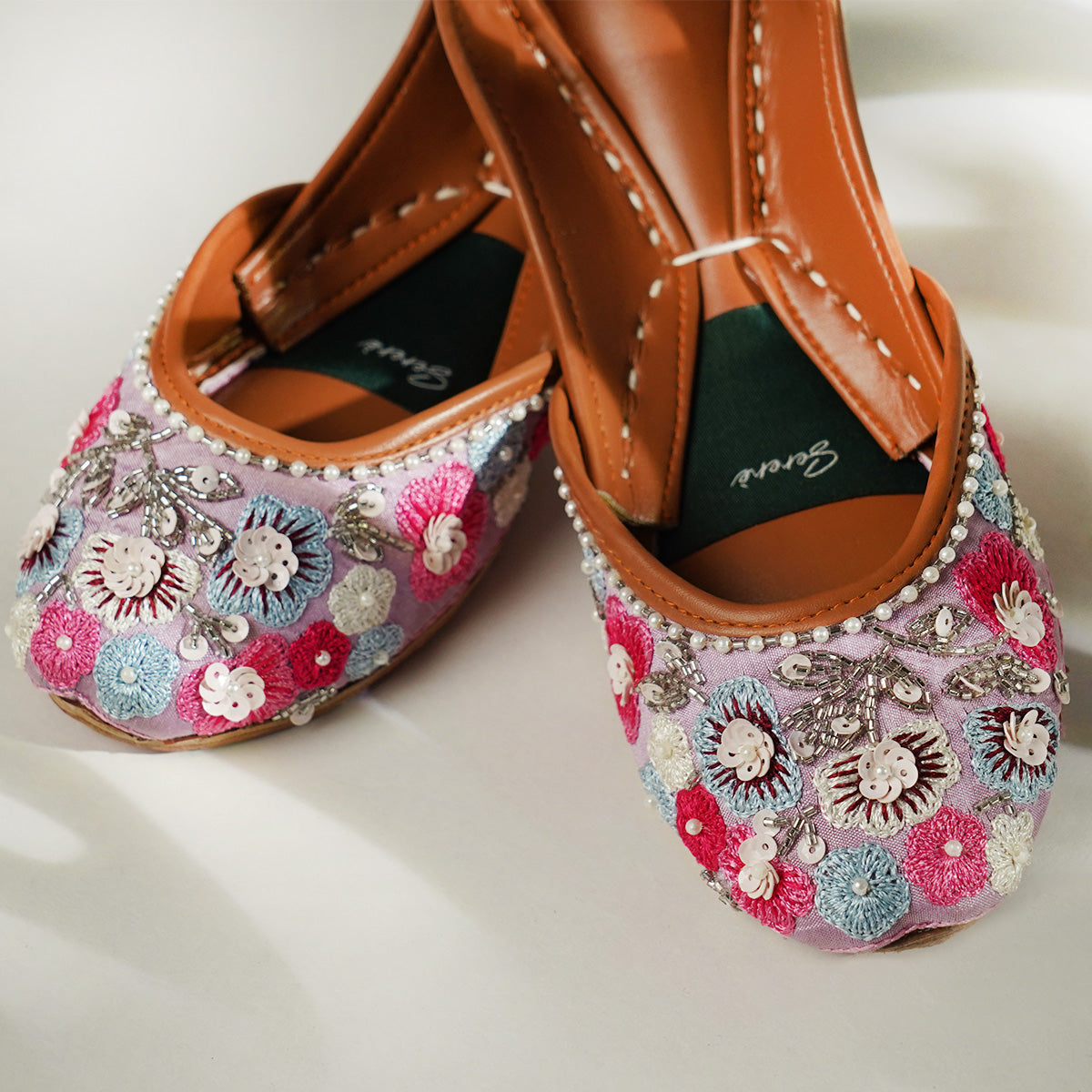 A true work of art perfect for festive wear and celebrations. The pastel upper is entirely blanketed in exquisite heavy handwork featuring shimmering sequins, delicate beads, and luminous pearls. This statement piece boasts a plush and soft sole ensuring maximum comfort and unmatched elegance.